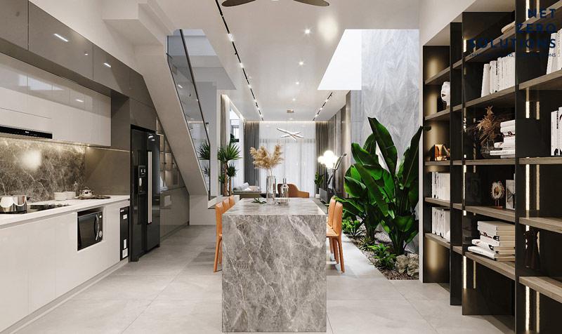 Thiết kế giếng trời sau nhà: Đối với những ngôi nhà có lô đất dài và hẹp, giếng trời đặt phía sau là lựa chọn tối ưu. Ánh sáng tự nhiên sẽ chiếu sáng vào các khu vực quan trọng như phòng bếp và phòng ăn, mang lại không gian sống tươi sáng và tràn đầy năng lượng. Kết hợp với cửa sổ lớn hoặc cửa kính, giếng trời phía sau còn tạo sự kết nối với cảnh quan bên ngoài, mở rộng tầm nhìn và mang thiên nhiên vào nhà.